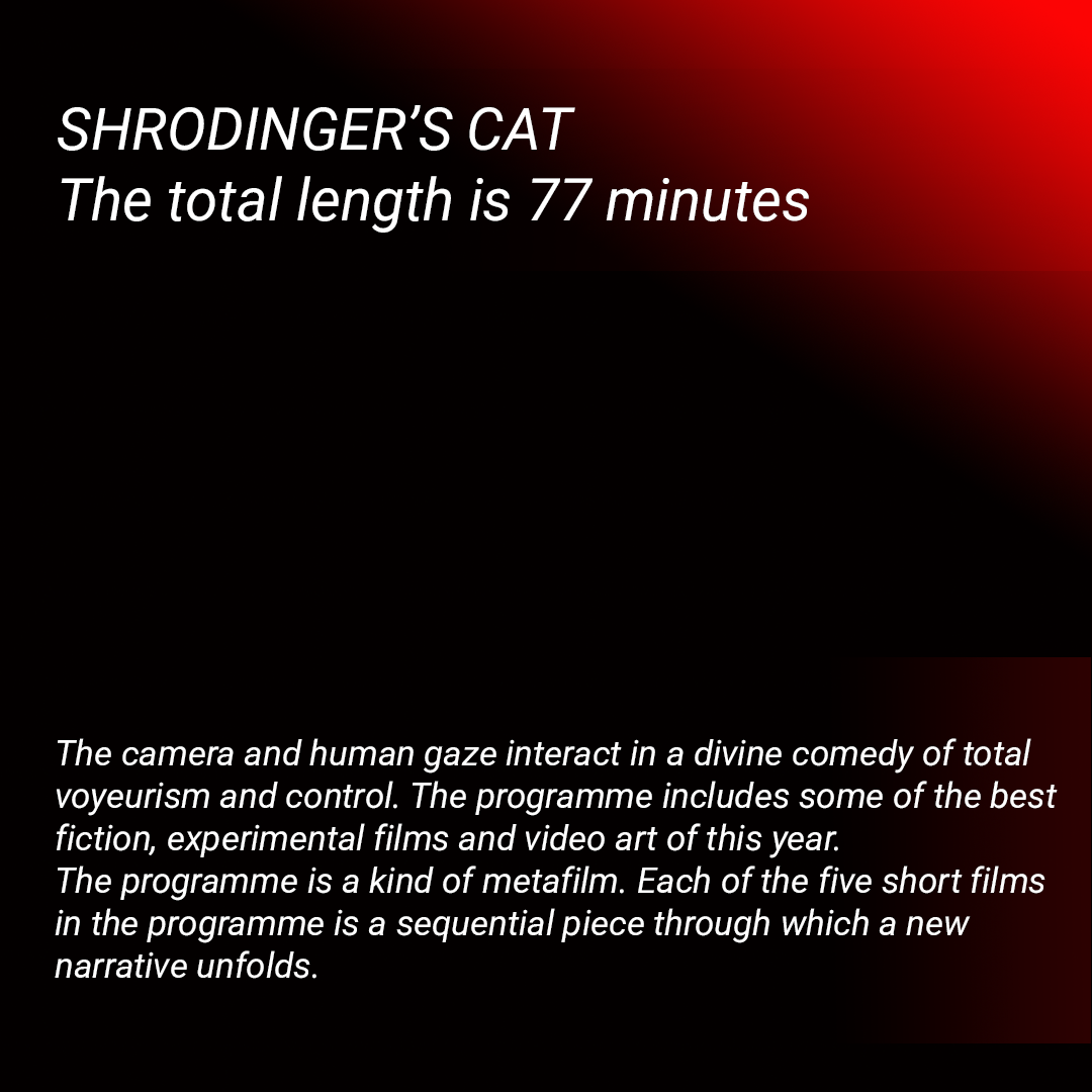 The camera and human gaze interact in a divine comedy of total voyeurism and control. The programme includes some of the best fiction, experimental films and video art of this year. The programme is a kind of metafilm. Each of the five short films in the programme is a sequential piece through which a new narrative unfolds.